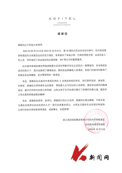 9月23日至10月8日,第19屆亞運(yùn)會(huì)在杭州舉行,杭州英冠索菲特酒店作為官方酒店,接待了來(lái)自多國(guó)的國(guó)家大使、運(yùn)動(dòng)員及工作人員。遼寧科技大學(xué)應(yīng)用技術(shù)學(xué)院旅游管理專業(yè)2020級(jí)學(xué)生何勁龍、姜金凱、劉禹彤3名在該酒店實(shí)習(xí)的學(xué)生有幸參加了全程接待工作。他們以高度的政治意識(shí)、飽滿的精神面貌、熱情周到的服務(wù)、精湛的專業(yè)技能對(duì)標(biāo)亞運(yùn)保障要求,積極融入工作團(tuán)隊(duì),為客人營(yíng)造了溫馨舒適、賓至如歸的入住體驗(yàn),出色地完成了接待工作,獲得中外來(lái)賓的高度贊揚(yáng)。酒店領(lǐng)導(dǎo)向?qū)W校發(fā)來(lái)感謝信,盛贊遼科大學(xué)生在亞運(yùn)會(huì)服務(wù)期間的出色表現(xiàn),彰顯了東道主熱情的待客之道、踏實(shí)的工作態(tài)度和積極進(jìn)取的精神。