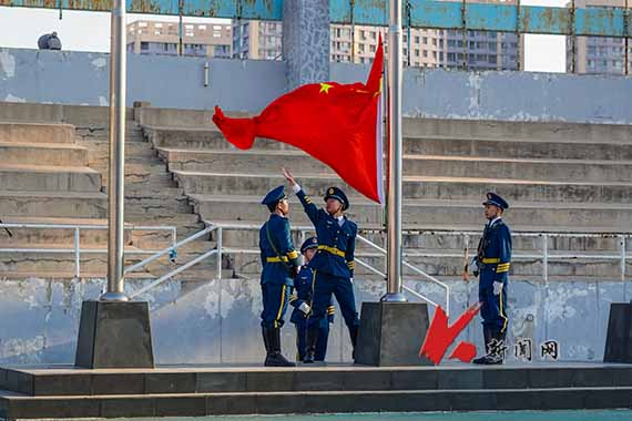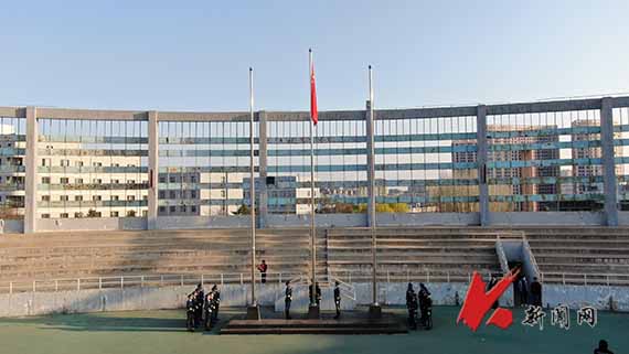 6∶30,升旗儀式開始。迎著初升的朝陽,升旗手、護旗手和護旗方隊伴著激昂的進行曲,踏著鏗鏘有力的步伐走向升旗臺。國歌響起,鮮艷的五星紅旗冉冉升起。全體師生莊嚴肅立,面向國旗行注目禮,高唱國歌。
