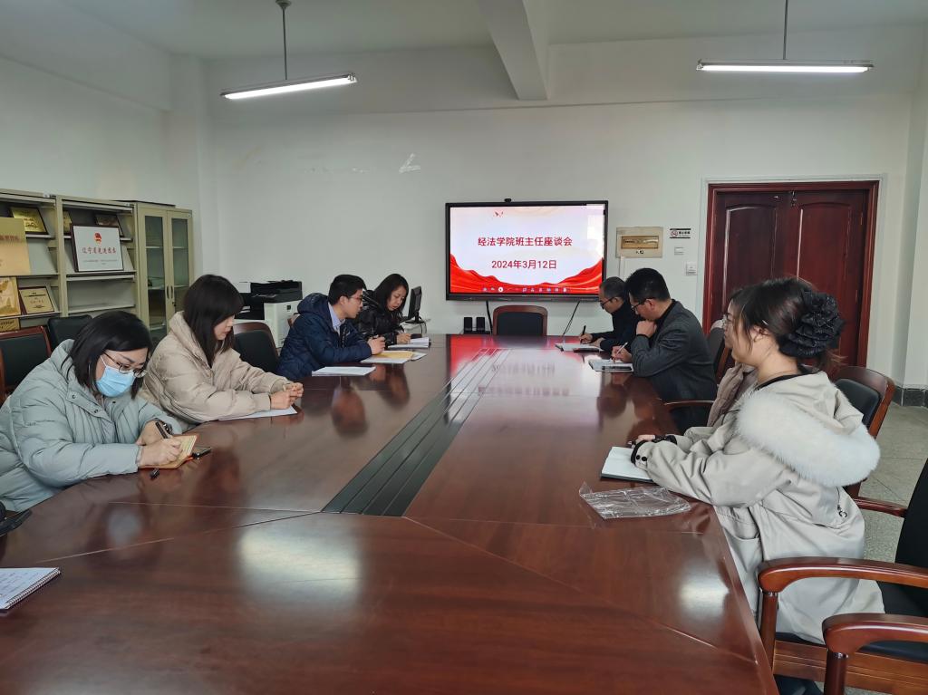 3月12日,經法學院于博識樓A315召開2023級班主任座談會議,會議由學院黨委副書記張國華主持,學院黨委書記趙智博、學辦主任齊艷萍以及李俊等7位2023級班主任參加了會議。