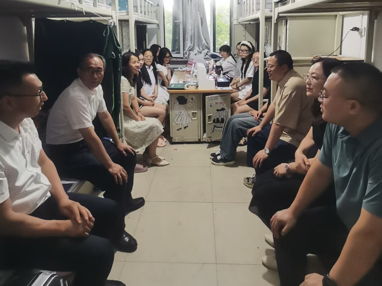座談會后,宋怡林副校長與經(jīng)法學(xué)院領(lǐng)導(dǎo)班子走進(jìn)畢業(yè)生寢室,與學(xué)生們圍坐在一起,親切交流,將關(guān)懷與問候送到每位學(xué)子心間。他們反復(fù)叮囑畢業(yè)生注意旅途安全,仔細(xì)詢問就業(yè)去向及未來發(fā)展規(guī)劃,還分享自己的大學(xué)寢室故事,讓寢室里充滿溫馨氛圍。