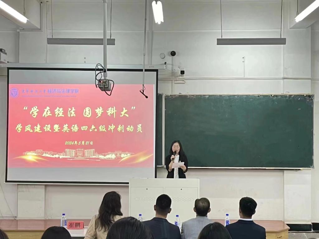 5月21日,經(jīng)法學院于博學樓C102召開“學在經(jīng)法,圓夢科大”學風建設暨英語四六級考試動員大會,學院黨委書記趙智博、黨委副書記張國華、學辦主任齊艷萍、團委副書記張鵬飛、金融系主任崔鵬、金融科技系主任郭威、國貿(mào)23-2班班主任李俊、金融科技23-2班班主任劉擎、金融23-2班班主任秦子璇出席會議,學院各年級近350名學生參加了會議。