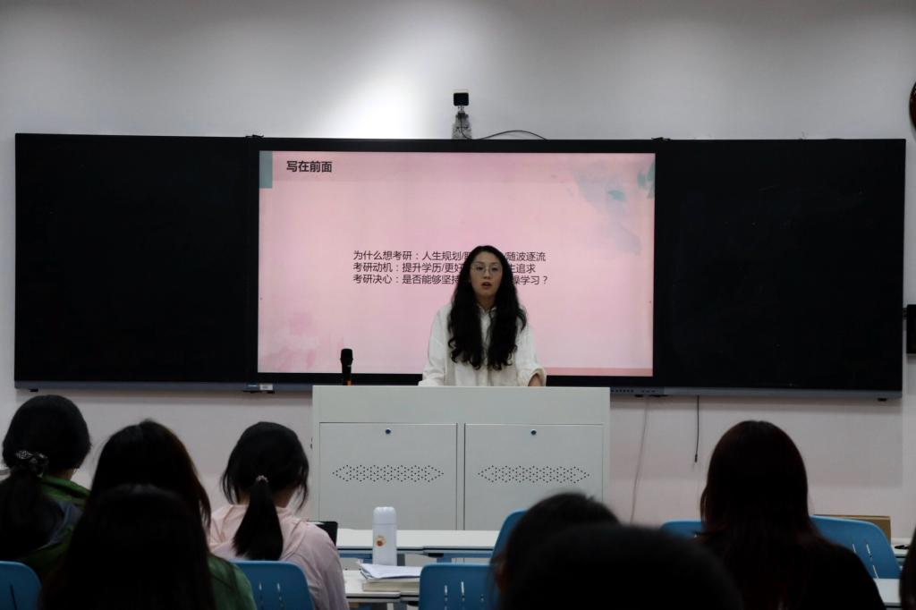 會上,四名2020級的同學分別結合自身經歷和所學專業向同學們分享自己考研成功上岸的經驗。在院校選擇方面,他們凝練出了“定好專業、選擇地區、篩選信息、劃定范圍、利用資源”的“五步定院校”法供大家參考,讓同學們對院校選擇有了更清晰的認識;在復習備考方面,他們分享了各自在備考過程中對于不同專業和學科的學習方法和備考技巧,同時提醒同學們做好時間管理與分配,規劃好相關學科的復習時間與進度,并提醒大家在制定規劃時理清思路、靈活應對,為同學們作出了細致而明確的引導;在備考心理上,他們建議備考學生做好打“持久戰”的準備,合理分配復習精力,在備考過程中保持良好心態,提升有效學習時間的同時要注意勞逸結合,以自信積極的狀態去面對困難。