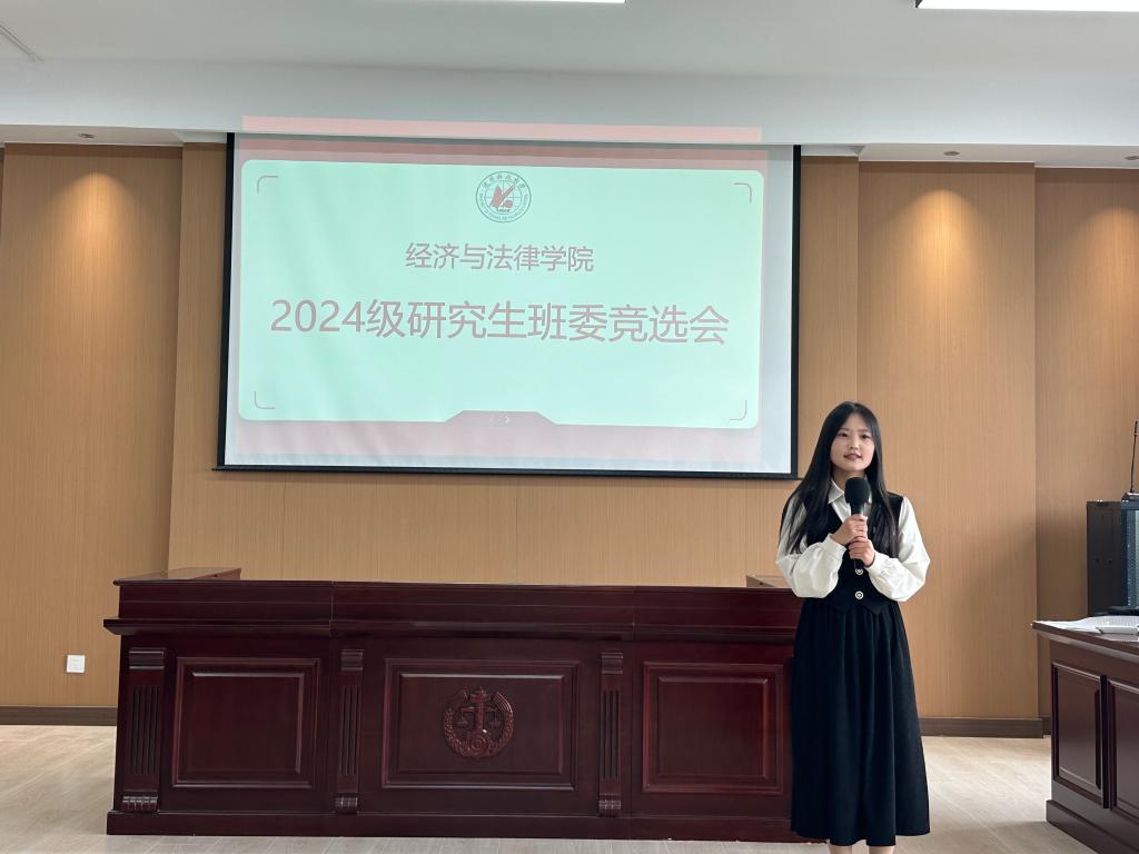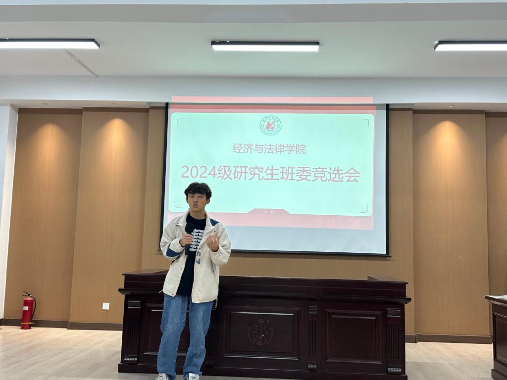 為使班級的各項工作及管理有序進行,讓同學們的生活、學習得到更好的維護與保障,9月18日,經法學院2024級研究生于博識樓A402開展班委競選活動,此次競選由經法學院研究生會執行主席張淇主持,研究生輔導員賀偉、學院研究生會主席團代表、學辦學生助管、學生代表7人組成評委會,2024級全體研究生參會。