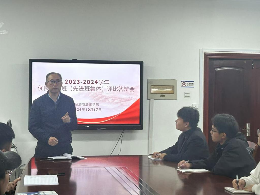 為進一步加強學風建設,引導各班級成員銳意進取、追求卓越,10月18日,經法學院于博識樓A503舉辦“2023-2024學年優良學風班(先進班集體)”評比答辯會。學院黨委書記趙智博、黨委副書記張國華、學辦主任齊艷萍、團委副書記張鵬飛擔任評委,學生會執行主席兼辦公室負責人趙心豪及24級學生代表參加本次答辯活動。