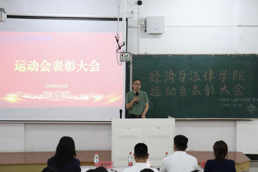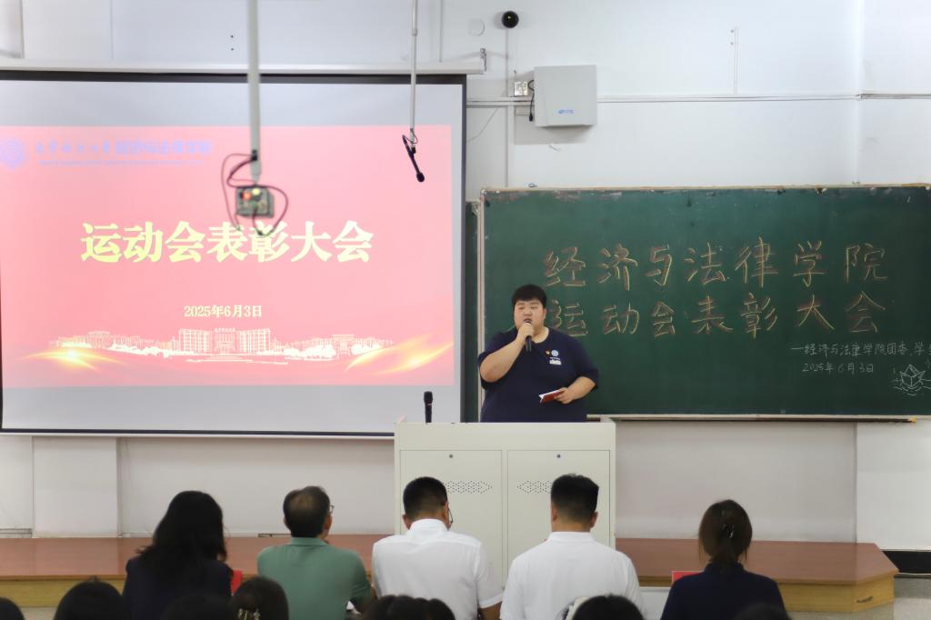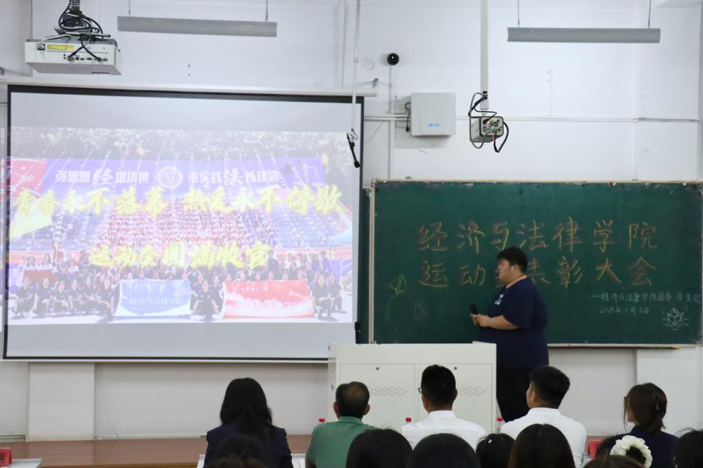6月3日,經法學院于博學樓C102召開第五十三屆運動會表彰大會。會議由學院學生會主席團成員劉家輝主持,學院黨委書記趙智博、黨委副書記張國華、學辦主任齊艷萍、團委副書記張鵬飛出席會議,學院全體團學骨干及運動員近200人參加會議。