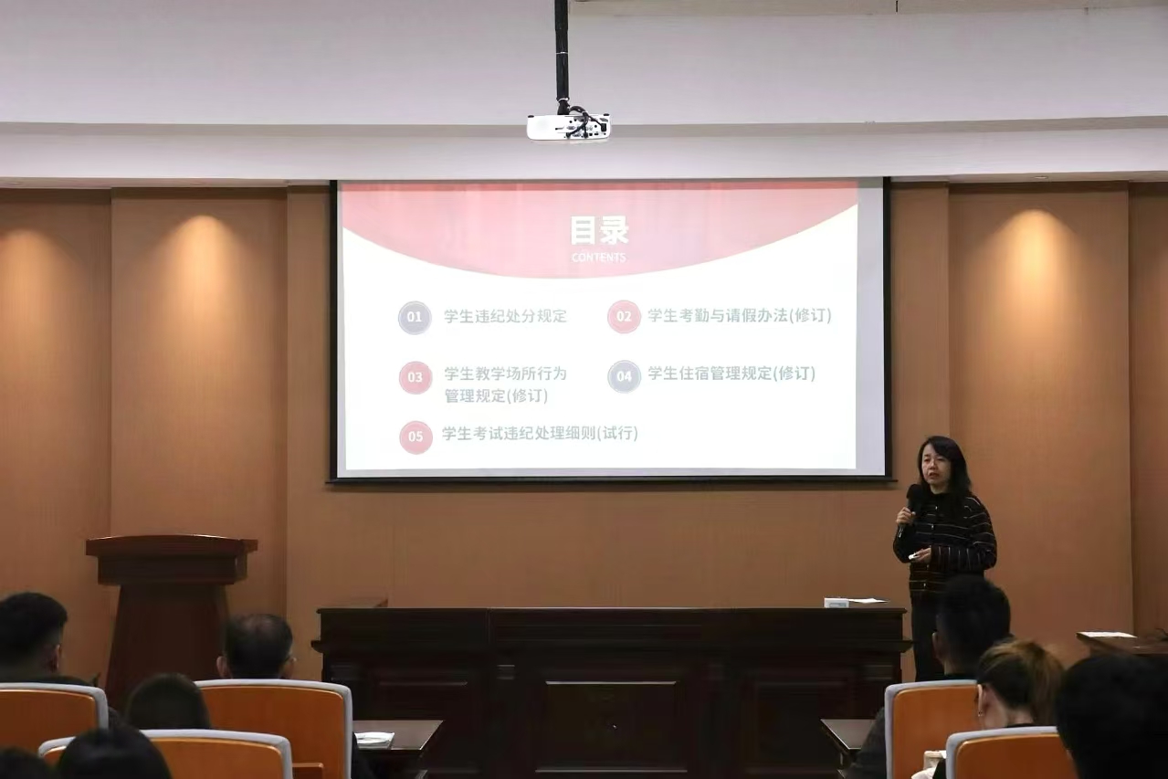 學辦主任齊艷萍針對學生規(guī)章制度、校園紀律、學生處分事宜、請假流程及考勤管理等方面進行了詳細講解。她著重強調了學生骨干帶頭遵守學生行為準則的重要意義,并要求全體同學務必遵守校園各項紀律規(guī)定,共同維護良好的校園秩序。