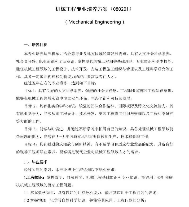 機械工程專業(yè)培養(yǎng)方案(080201)(2017版)