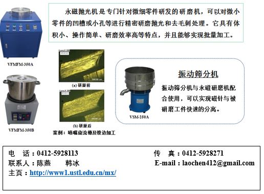 研制的磁性磨料有10種類型以上,可以適用不同的材料和加工精度要求,粒徑大小在20μm-1000μm范圍內。兼具磁性和研磨性,且研磨性能良好,使用壽命長。可適用于玻璃、輕質合金、鑄鐵、銅鋁合金、高碳鋼、合金鋼和軸承鋼系列材料。