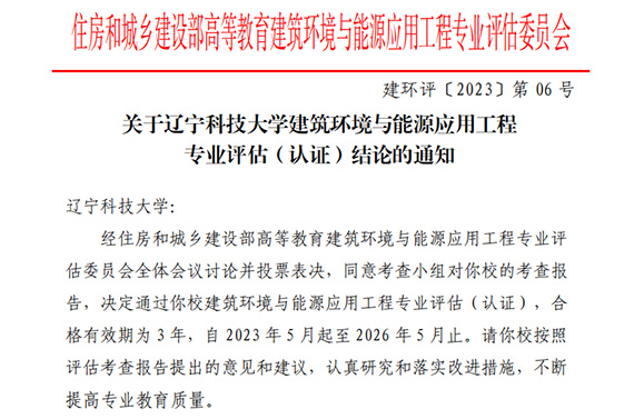 近日,由《關于遼寧科技大學建筑環境與能源應用工程專業評估(認證)結論的通知》(建環評〔2023〕第06號)獲悉,經住房和城鄉建設部高等教育建筑環境與能源應用工程專業評估委員會全體會議討論并投票表決,遼寧科技大學建筑環境與能源應用工程專業順利通過評估(認證),有效期為3年,自2023年5月起至2026年5月止。