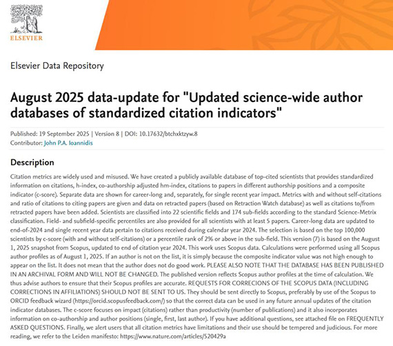 該榜單基于標準引文指標的全科學作者數據庫,從全球近700萬名科學家中甄選出各學科領域排名前2%的學者,覆蓋22個領域和174個子學科。排名主要依據六類核心指標,總引用量、H指數、共同作者修正的Hm指數、單獨作者文章的引用量、單獨或第一作者文章的引用量和單獨、第一或最后作者文章的引用量,能夠更客觀、更真實地反映科學家的產出量和學術影響力,為科學家長期科研表現提供了一個衡量指標。(供稿單位:圖書館 圖片來源:圖書館)