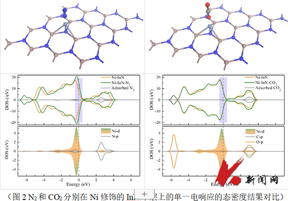 選擇性差是氣體傳感器面臨的普遍問題。特別是當二元混合氣體共吸附時,每種氣體的電響應(yīng)貢獻不能被合理的分配。本文以CO2和N2為例,利用密度泛函理論揭示了過渡金屬(Fe, Co, Ni, Cu)修飾的InN單層的選擇性吸附機理(圖1)。結(jié)果表明,與純InN單層相比,Ni修飾提高InN單層的導(dǎo)電性,表現(xiàn)出與N2更強的親和力。該工作首次強調(diào)了態(tài)密度在描述電響應(yīng)上的重要性,Ni修飾的InN單層實現(xiàn)了對N2的單一電響應(yīng),消除了CO2的干擾(圖2)。此外,d帶中心理論解釋了Ni原子在氣體吸附性能中優(yōu)于Fe、Co和Cu原子的原因。該研究為揭示氣體敏感材料的高選擇性機理提供了新的視角。