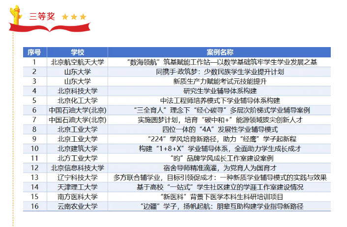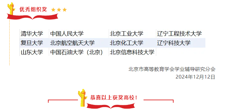 學業輔導研究分會是北京市高等教育學會下屬的專業學會,成立于2017年5月,目前是北京以及全國高校進行學業輔導工作溝通、交流、討論、研究的最高平臺。今年6月12日,北京市高等教育學會學業輔導研究分會面向全國高校啟動“新質引領心智,學業促進成才”高校學業輔導優秀案例評選活動,旨在引導高校深入研究“新質生產力對提升學業輔導效能的路徑”,從理論創新和實踐創新兩個方面促進學業輔導工作規范化、精品化、科學化,推動輔導隊伍專業化、職業化建設,提升大學生思想政治教育工作質量。此次活動共征集到28所高校51個學業輔導優秀案例。經過專家函評,評選出一等獎12個,二等獎16個,三等獎16個,優秀組織獎11所高校。