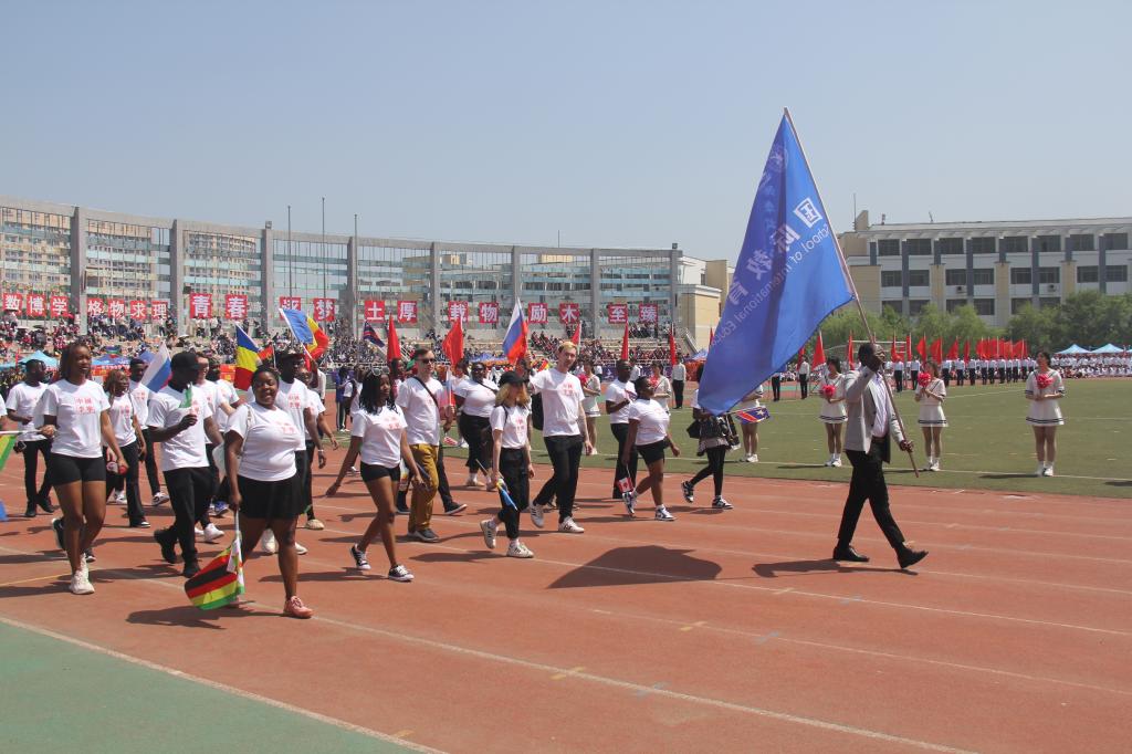開幕式中,國際教育學院的學生們排著整齊的隊形,大踏步向主席臺走來。同學們個個衣著鮮艷,面帶笑容,昂首闊步,充分的展示出青年特有的朝氣與活力。